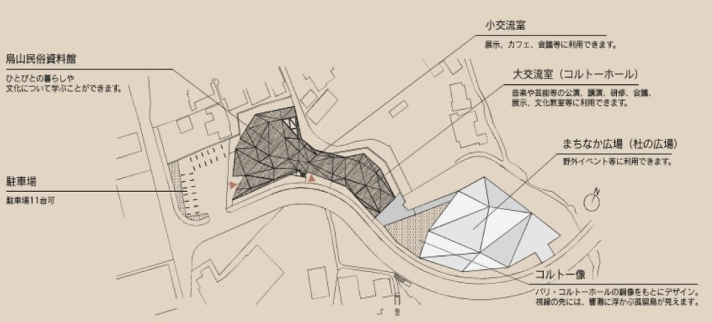 お車でお越しの方は、コルトーホールのすぐとなり(東側。↑の地図の右下あたり)の「まちなか広場(杜の広場)」